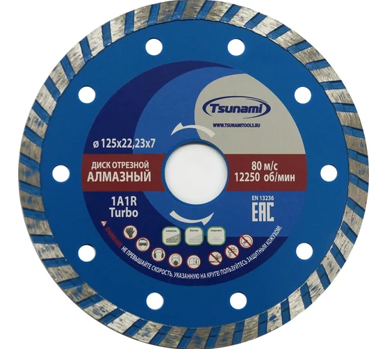Универсальный диск, использующийся и для сухой, и для мокрой резки. Отличается наличием косой насечки на режущем лезвии. Она увеличивает механическую прочность круга и значительно усиливает интенсивность отвода тепла, что позволяет ускорить резку. Как и сегментные диски «Турбо» пригодны для быстрой резки любых минеральных материалов широкого диапазона твердости: бетона, гранита, кирпича, строительного камня, тротуарной плитки.