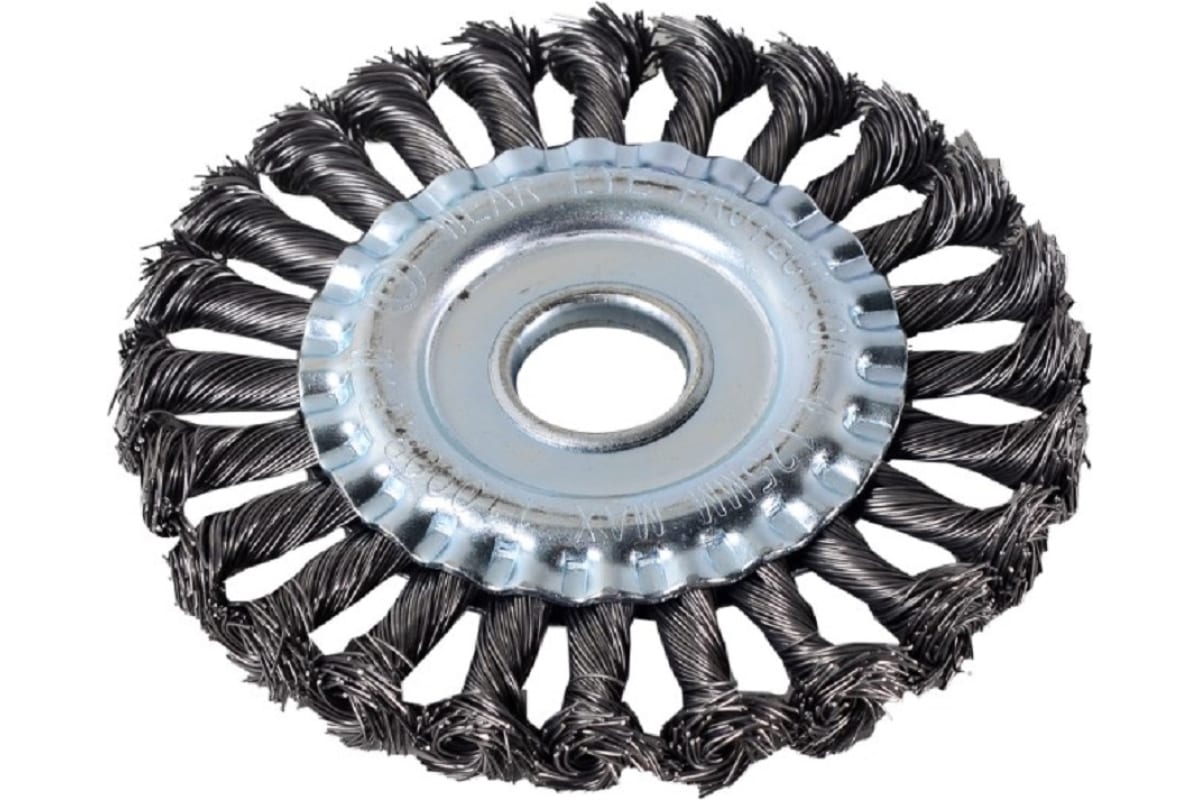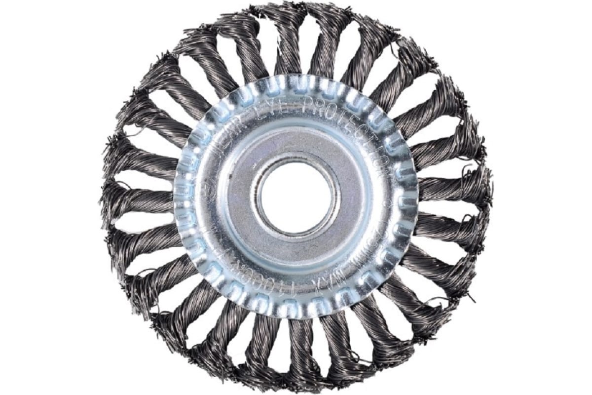 Щётка для УШМ плоская, крученая, 125 мм Вихрь – это сменная насадка для шлифовальной обработки поверхности. Изготовлена из упругих плетёных пучков из стальной проволоки. Предназначена для зачистки от лака, краски и коррозии, работы со сварочной окалиной, обработки материалов высокой плотности.