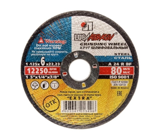 Круги зачистные (шлифовальные) по металлу на бакелитовой связке Лужского Абразивного Завода для ручных шлифмашинок применяются для высокопроизводительной зачистки деталей и конструкций из различных марок сталей. Диаметр 125мм. Толщина 6,0мм. Посадочный диаметр 22мм.