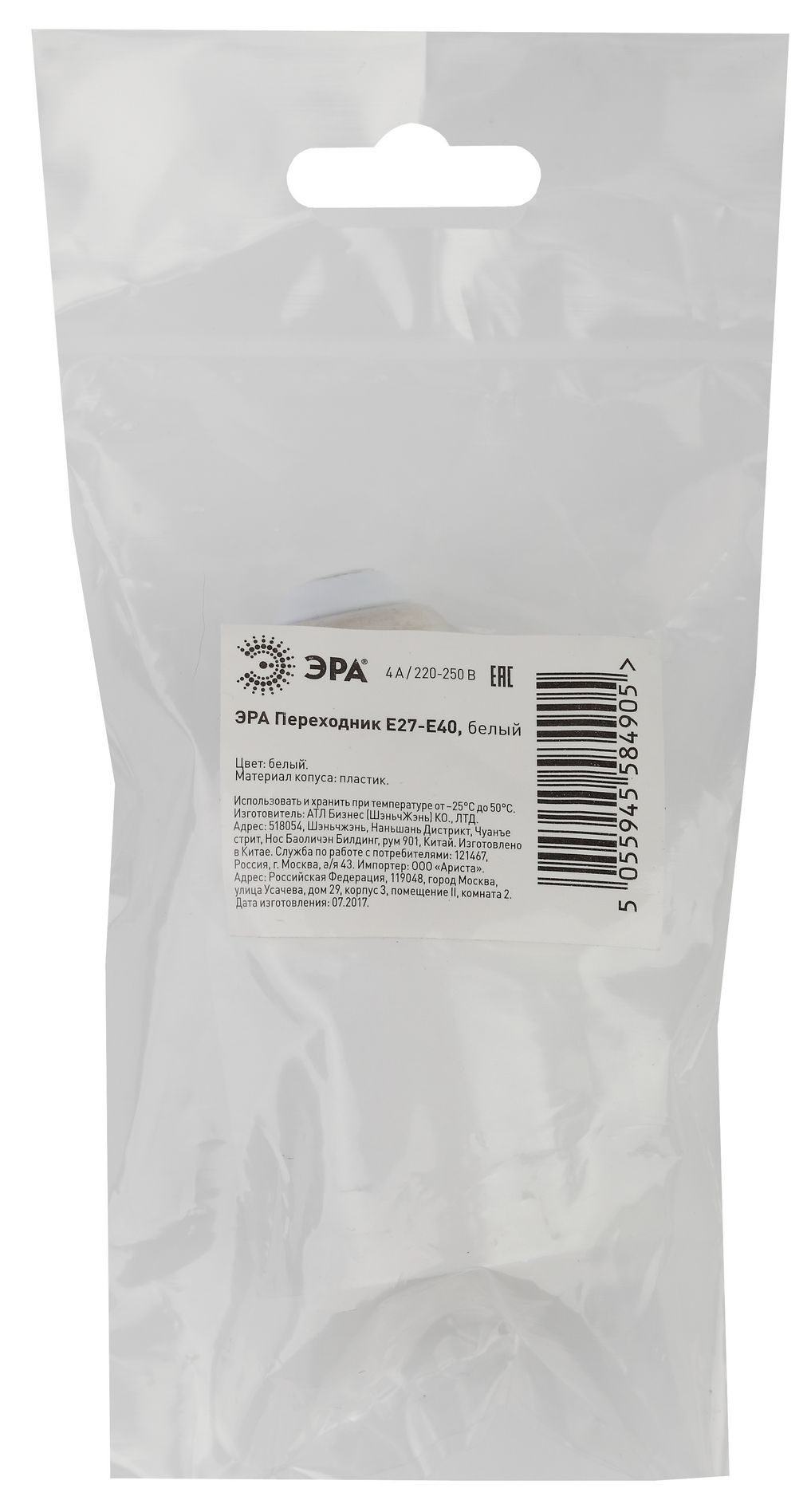Переходник ЭРА E27-E40 пластиковый белый