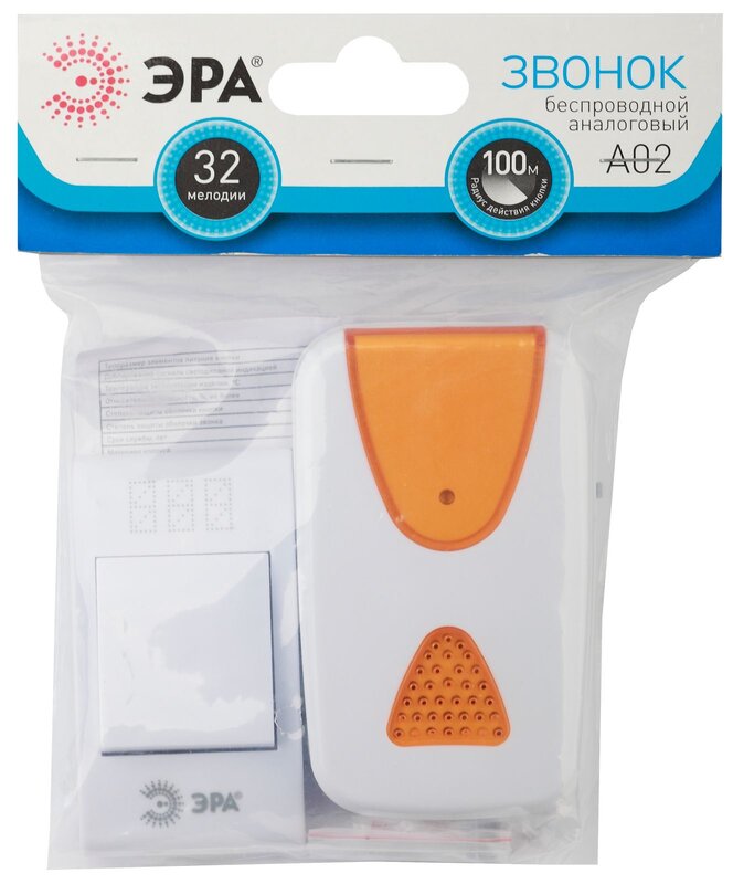 Звонок дверной ЭРА A02 беспроводной аналоговый белый с оранжевым 32 мелодии